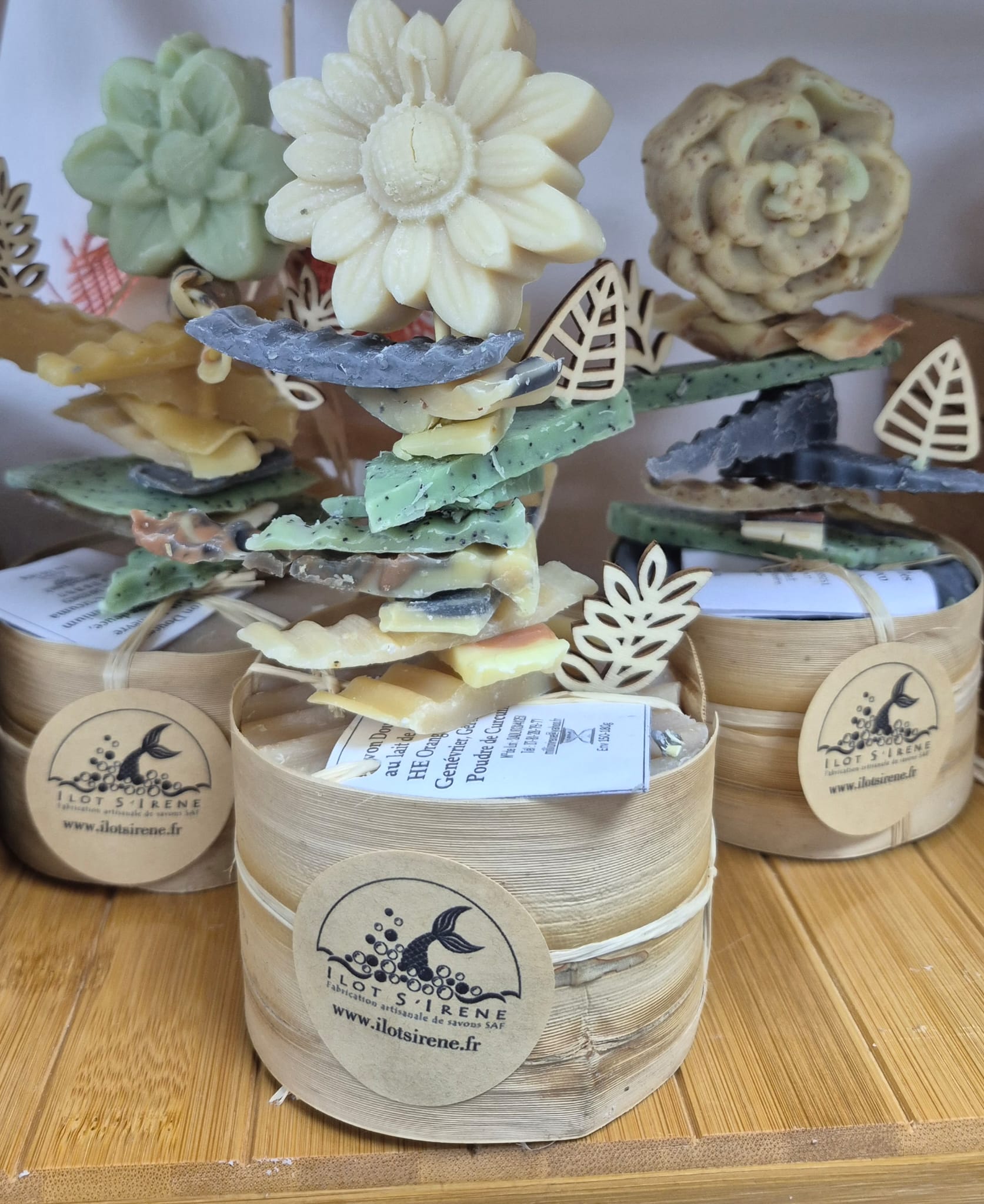 1 coffret de 2 gros savons ronds (dans le socle) avec tout un échantillonnage de senteurs avec un savon en fleurs idéal pour les cadeaux